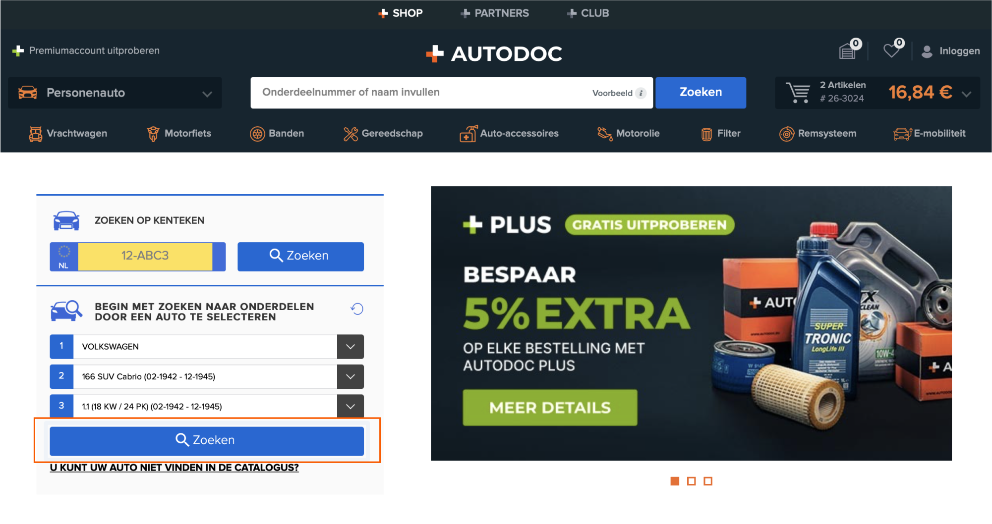 Om het juiste onderdeel te vinden, vul de gegevens van je auto (merk, model en motorversie) of het kenteken in.