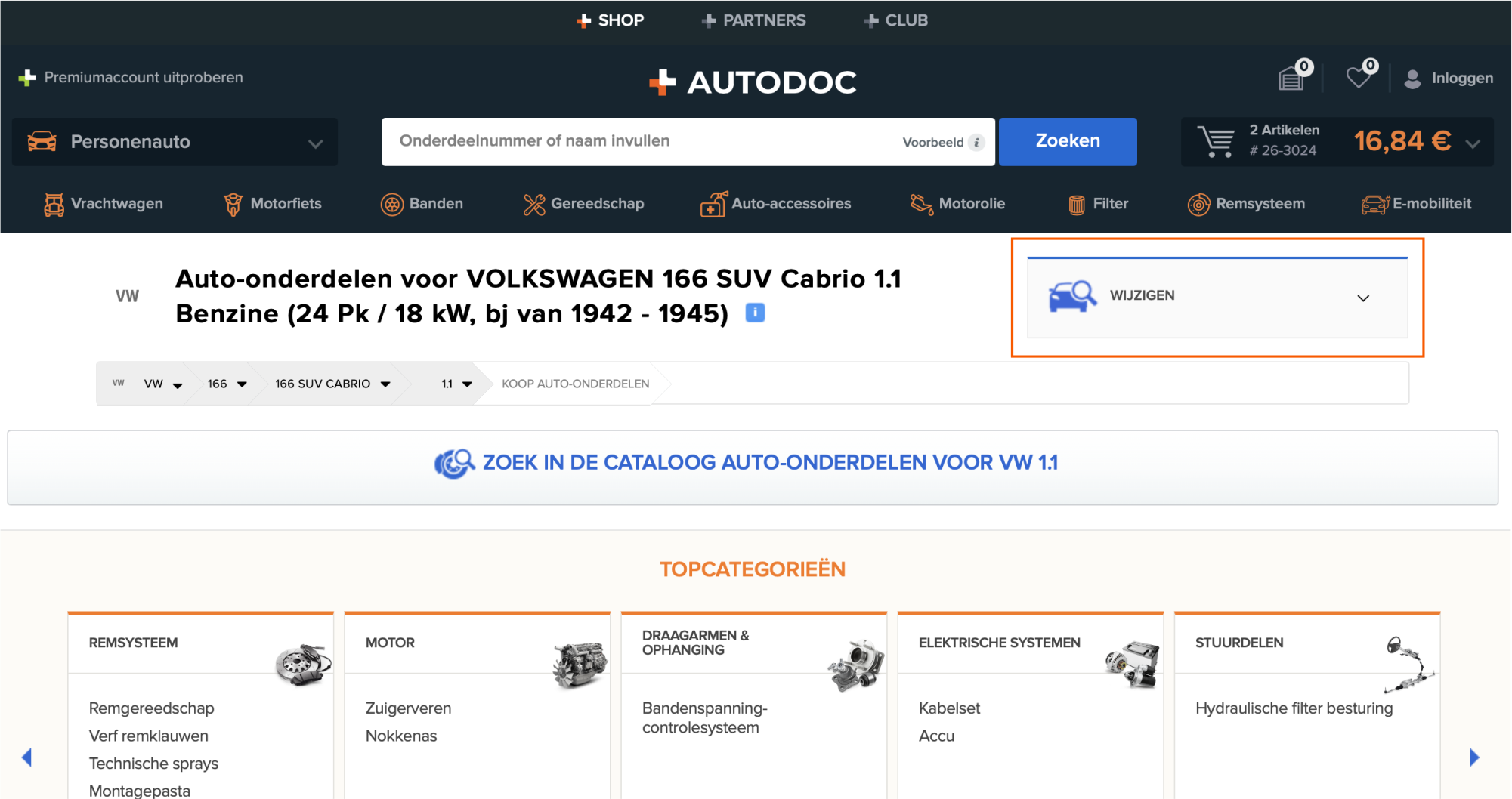 Als je een fout hebt gemaakt bij het invullen van de voertuiggegevens, kun je deze op de cataloguspagina corrigeren door te klikken op WIJZIGEN.