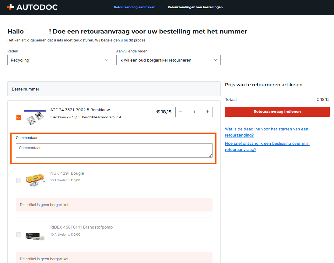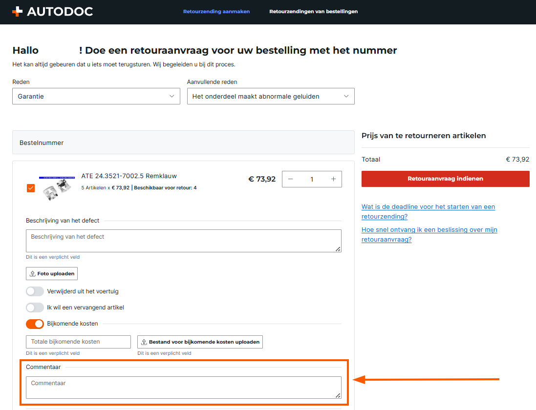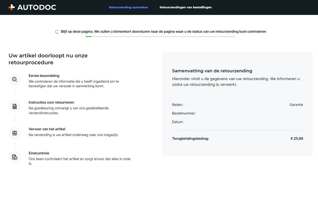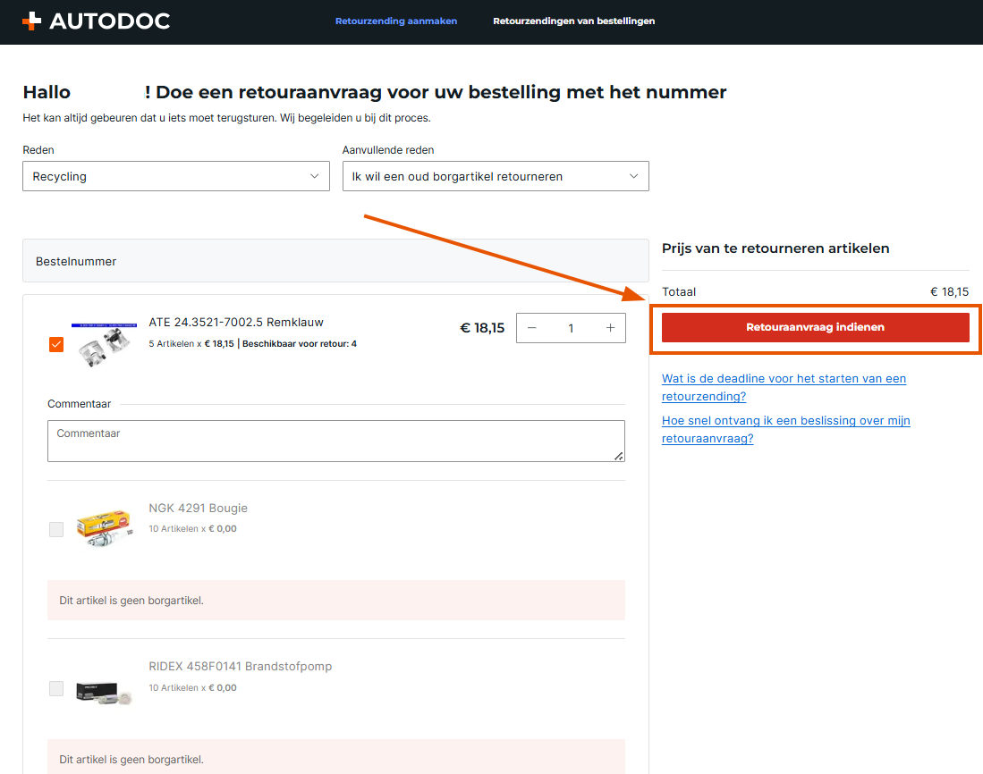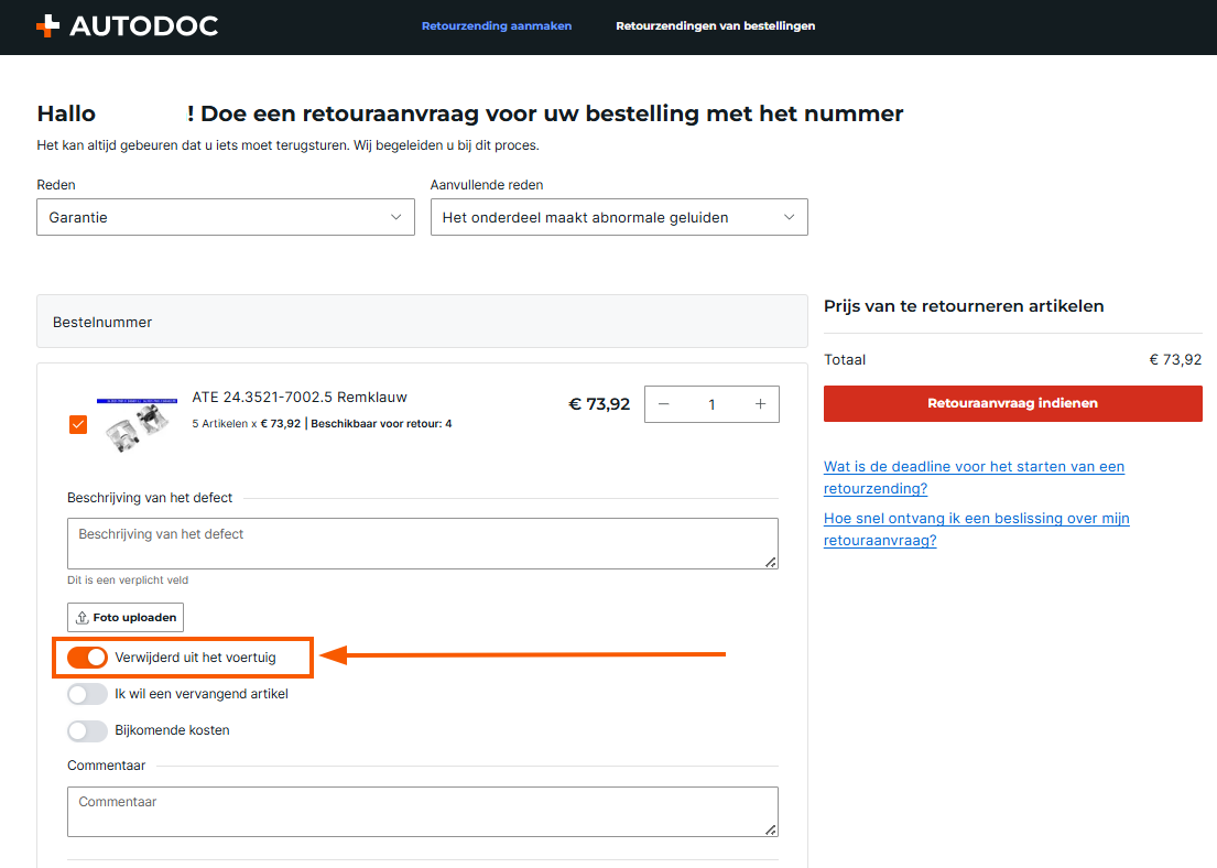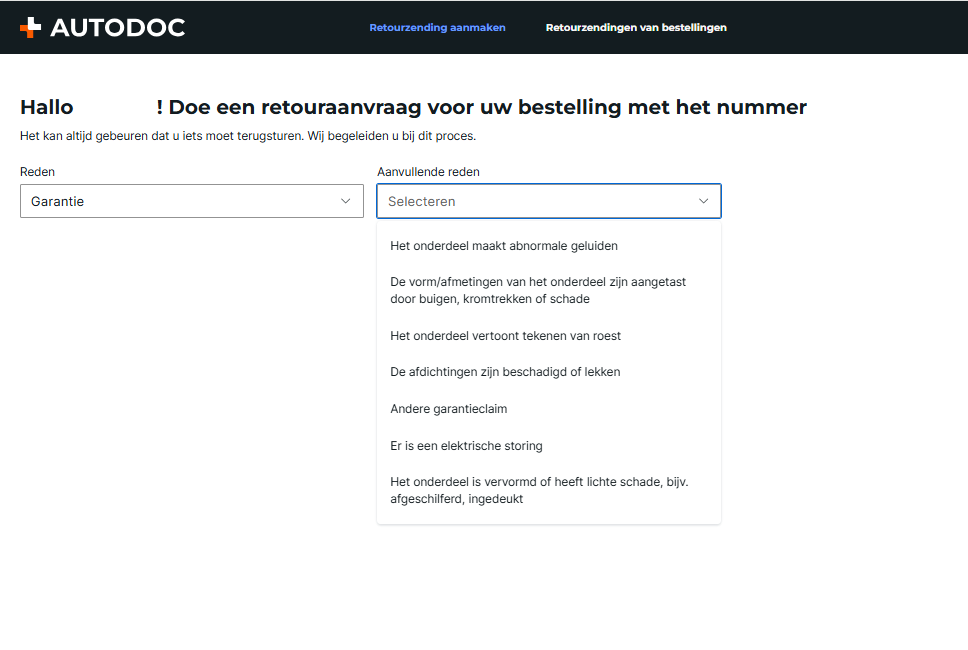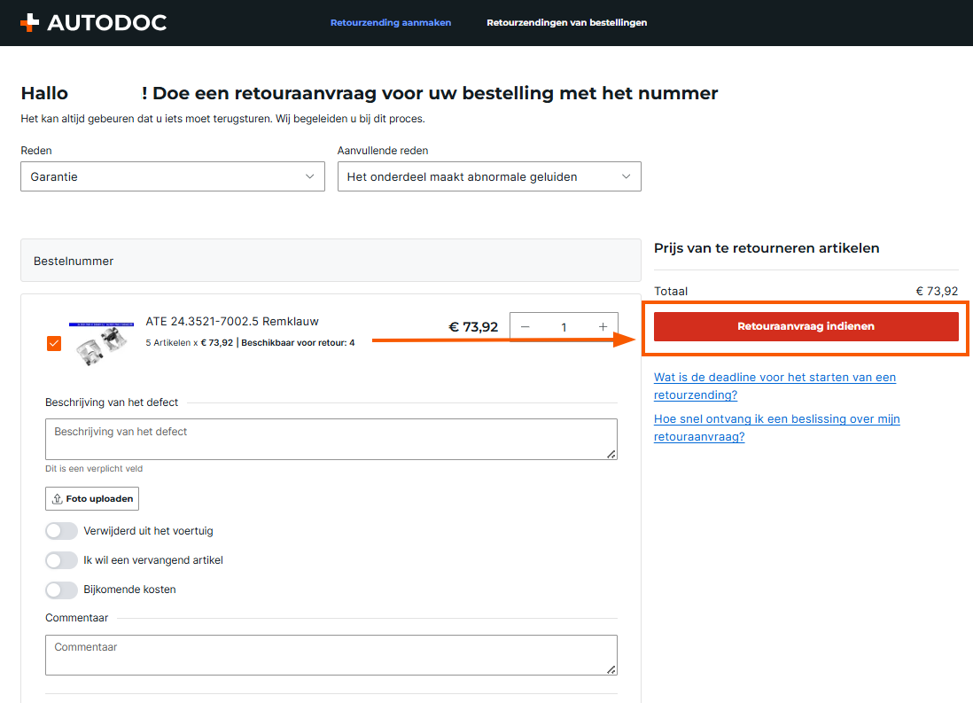 - Klik op Retouraanvraag indienen om de garantieclaim ter beoordeling naar ons op te sturen.