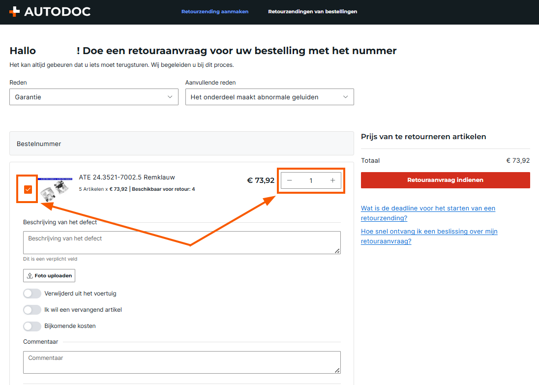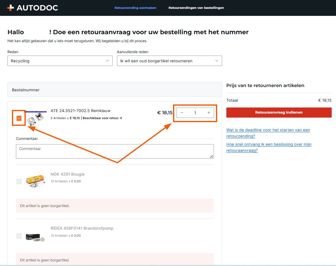 - Zodra je een reden hebt geselecteerd, moet je het artikel selecteren met behulp van het selectievakje en het aantal te retourneren artikelen aangeven.