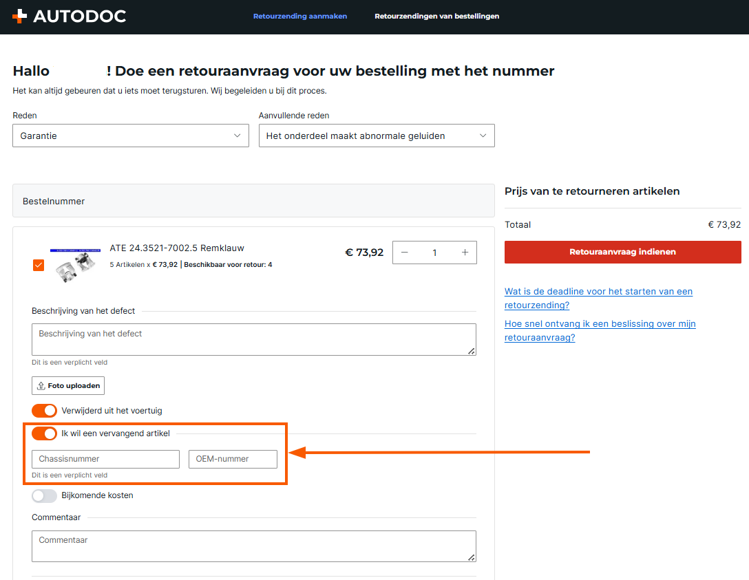 - Geef aan of je een vervangend artikel wilt. De knop Ik wil een vervangend artikel wordt oranje wanneer deze geactiveerd is. Dit geeft aan dat vervanging nodig is.Let op:Als er een vervangend onderdeel nodig is, moet het chassisnummer en/of het OEM-nummer van het onderdeel worden opgegeven.