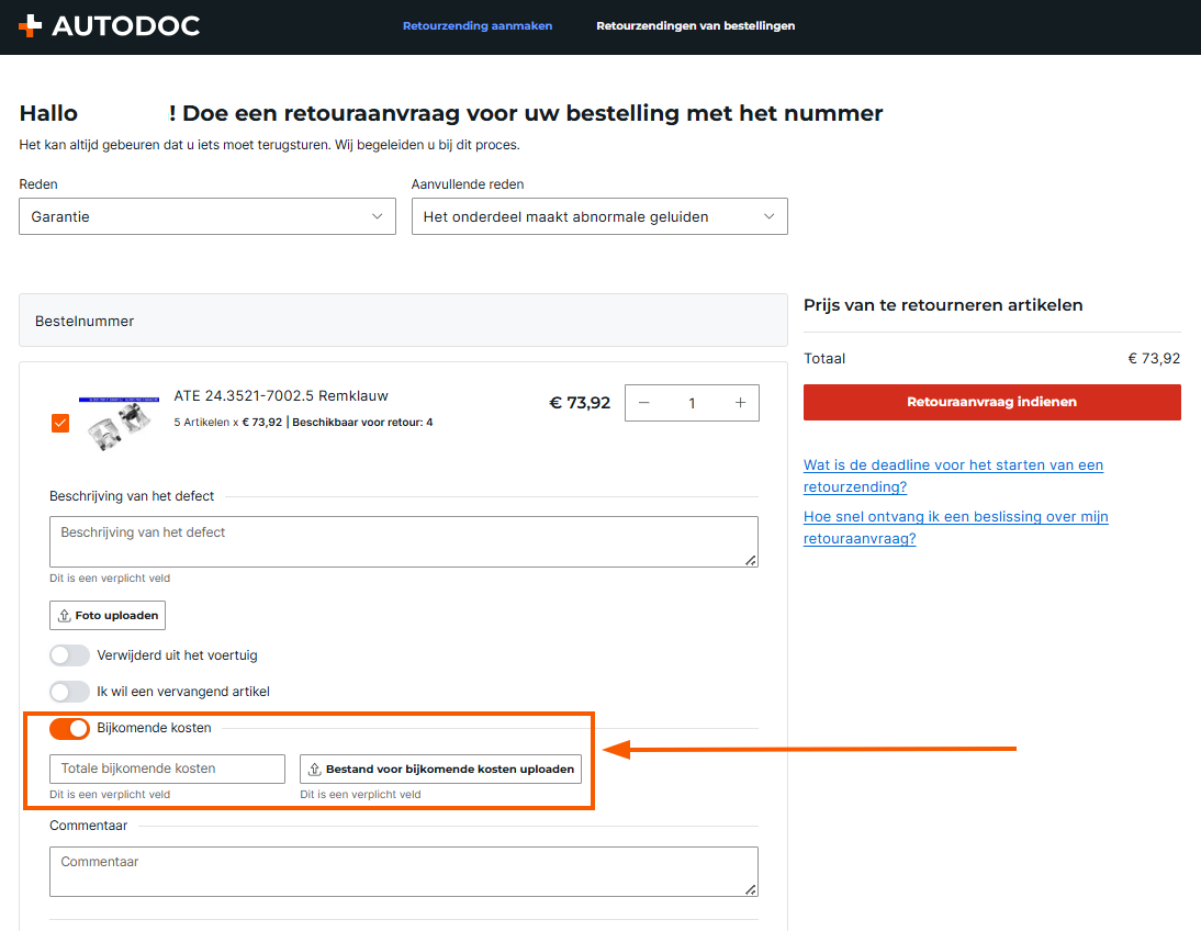 Als je extra kosten hebt, is er nog een veld om in te vullen: Totaal extra kosten, waar je het bedrag van alle extra kosten in verband met het garantiegeval moet opgeven.