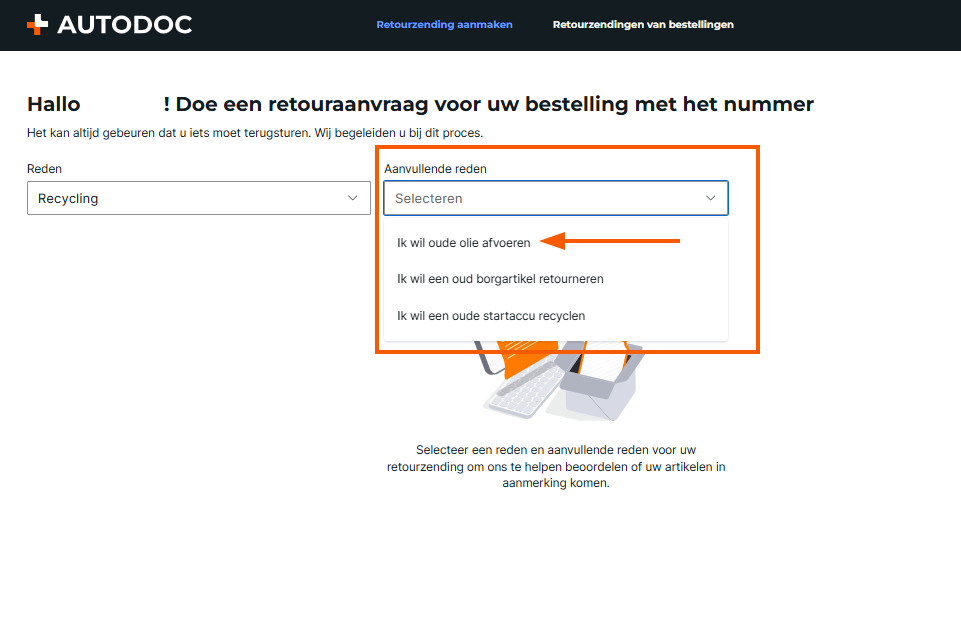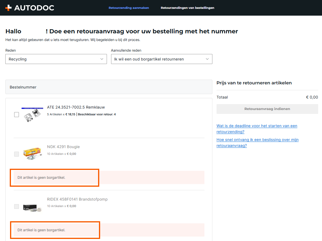 Hoe retourneer ik een borgartikel of andere onderdelen voor recycling via het retourportaal?