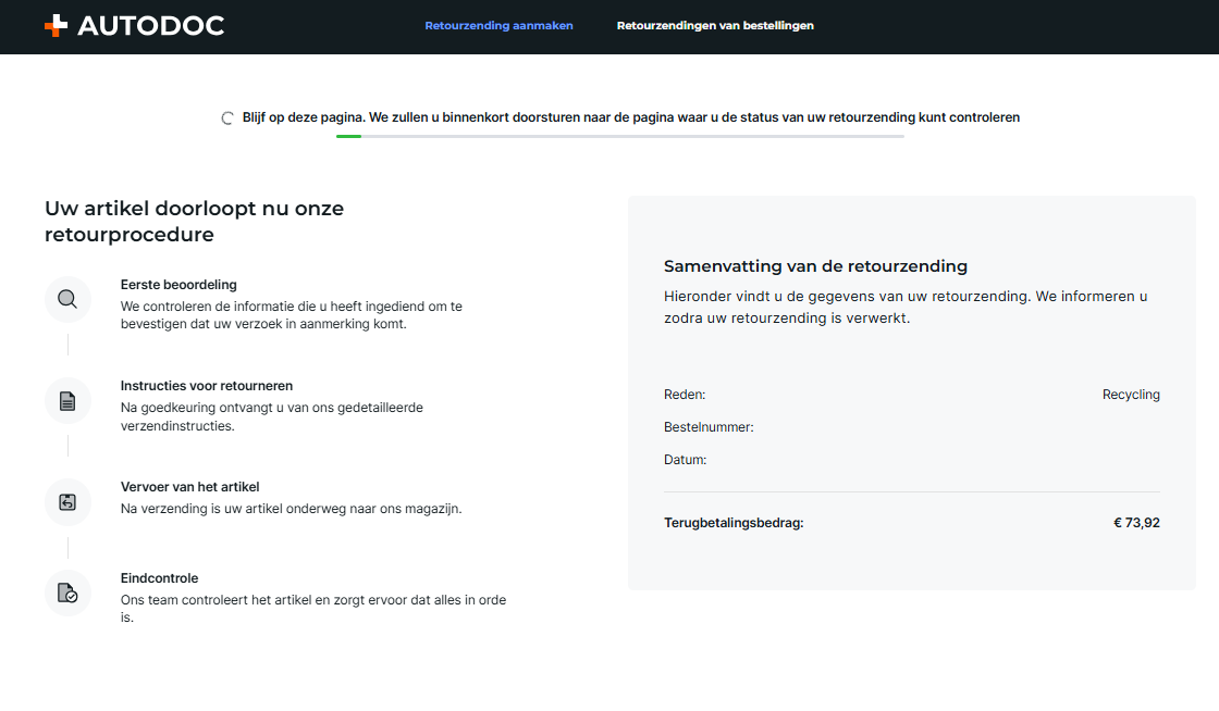 - Wanneer het indienen van de retouraanvraag is voltooid, verschijnt een mededeling op het scherm zoals getoond in de onderstaande screenshot.