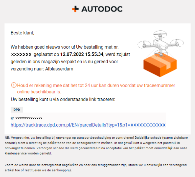 - Zodra wij uw bestelling hebben ingepakt en verzonden, ontvangt u een e-mail met een trackingnummer. Gebruik het om de locatie van uw pakket te volgen.