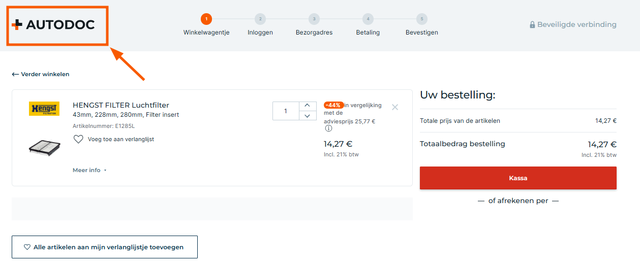 Let op: het land waar de levering naartoe gaat, moet overeenkomen met de taalversie van de gebruikte website. Om bijvoorbeeld producten te bestellen die in het Verenigd Koninkrijk moeten worden bezorgd, moet je autodoc.co.uk gebruiken. Anders zullen bepaalde productcategorieën niet kunnen worden bezorgd (bijv. volumineuze artikelen).