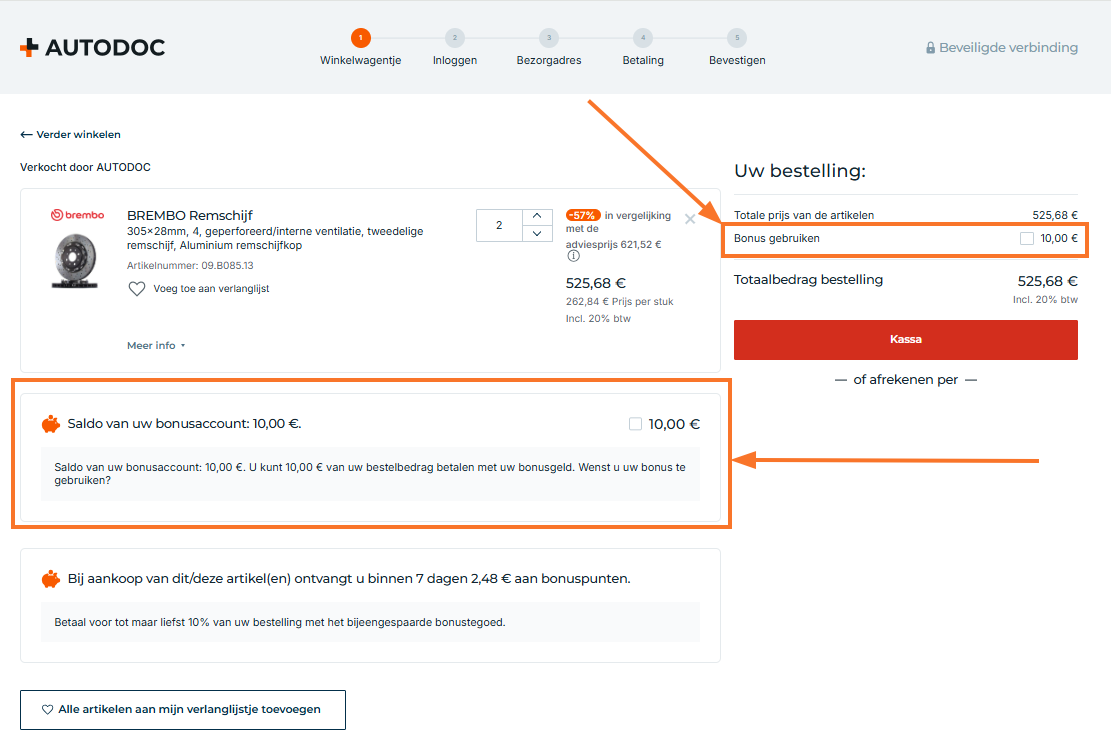 Aan de kassa kun je jouw bonustegoed zien en dit gebruiken door op het keuzevakje te klikken: