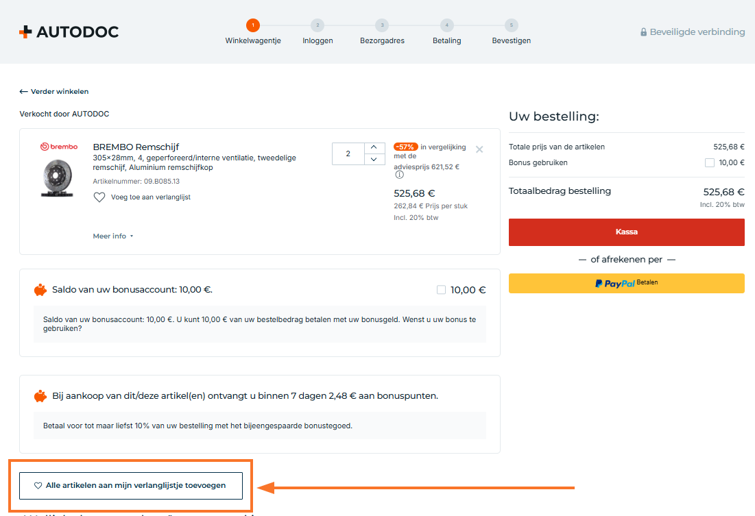 Om alle artikelen van je winkelmandje aan je verlanglijst toe te voegen, klik je op Alle artikelen aan mijn verlanglijstje toevoegen. Er verschijnt dan een bericht dat alle artikelen aan de verlanglijst zijn toegevoegd.